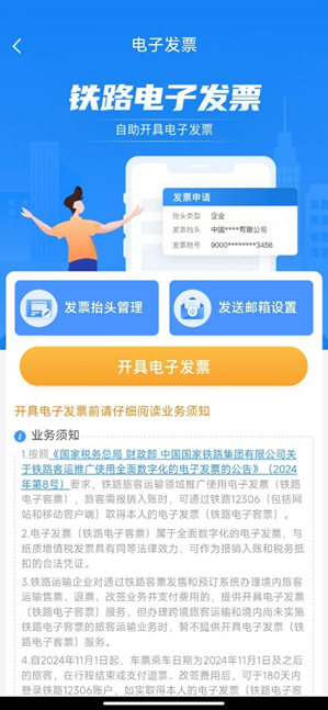 国家税务总局、财政部、中国国家铁路集团有限公司发布公告,2024年11月1日起,我国铁路客运领域将推广使用全面数字化的电子发票。