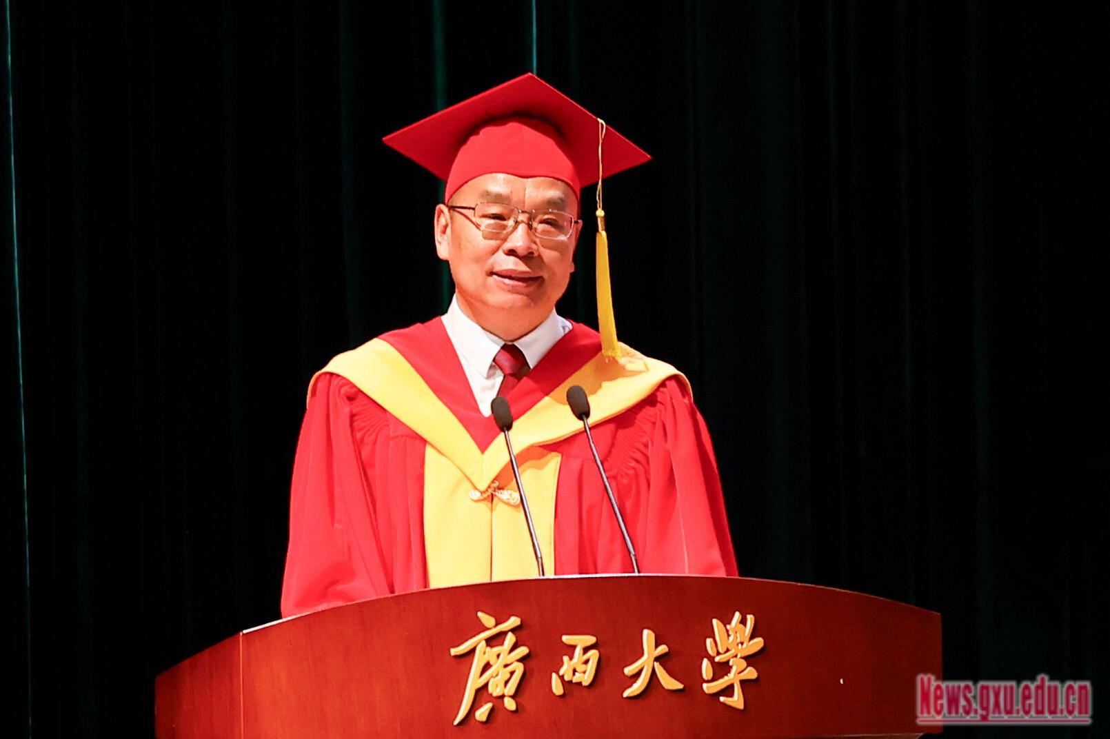 Wang Naixue, Vice Chairman of theGunangxi ZhuangAutonomous Region CPPCCand Secretary of the CPC GXU Committee,conferred degrees to the graduates