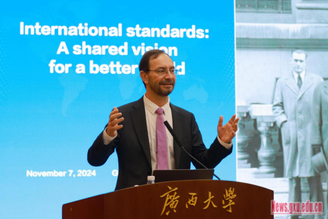 Before the unveiling ceremony,Mr.Mujica delivered a keynote speechentitled,“International Standards: A Shared Vision for a Better World”totheaudience ofover 200 facultymembersand studentsfrom Guangxi University and otherschools.He alsocommunicated and interactedwith the audience onvarioustopics, includingwaysto participate in thedevelopmentof ISO international standards, talent cultivationbased oninternational standardization, and therole ofstandardizationin reducingcarbon emission.