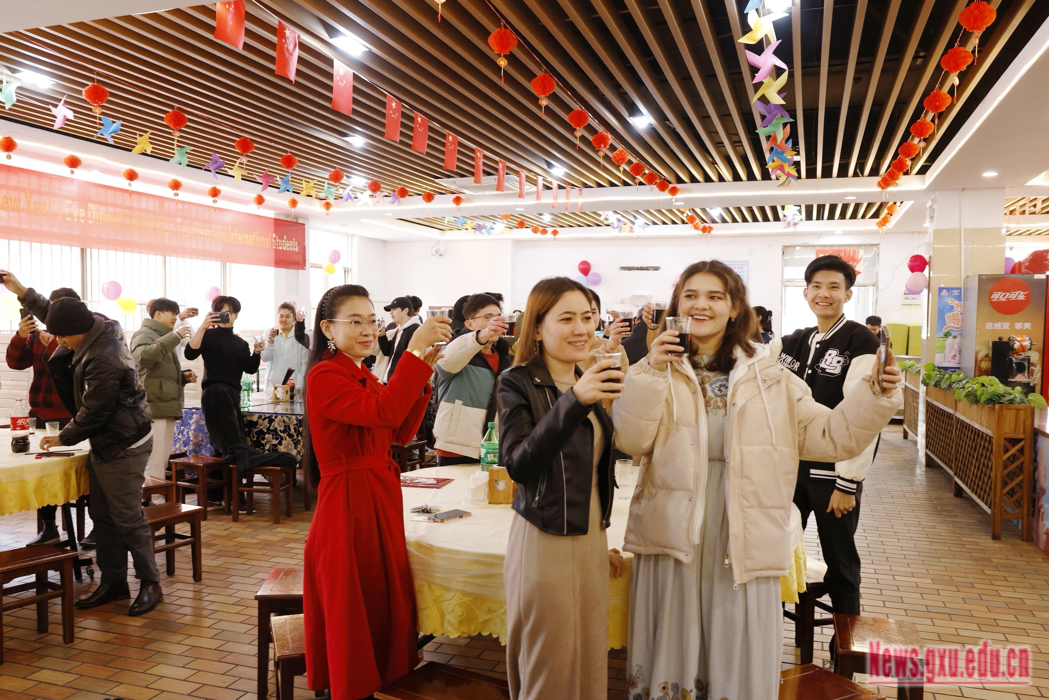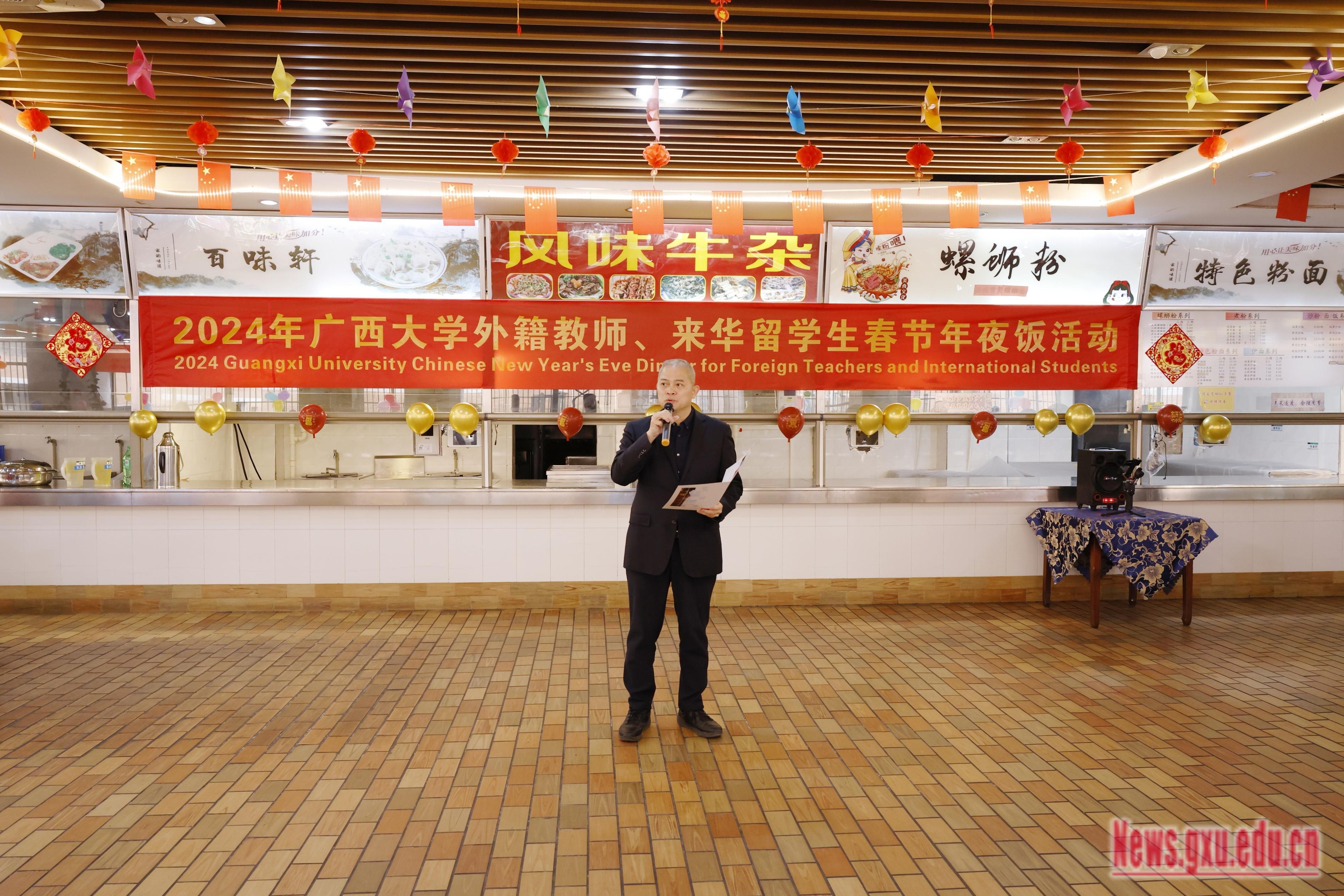 On February 9th, our school held the 2024 Guangxi University Foreign Teachers and International Students Spring Festival Eve Dinner event. Liu Xiang, a member of the Standing Committee of the Party Committee and Vice President of the school, gathered with foreign teachers and students studying in China to celebrate the Chinese New Year's Eve dinner.